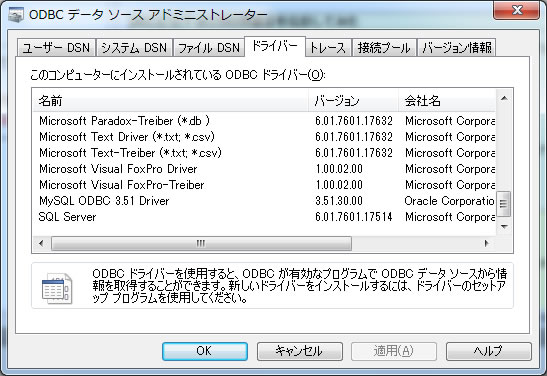 ODBCコネクターのバージョンは3.51.30と5.1.12の2種類あったので、MySQLのバージョンに近い方を選択した。