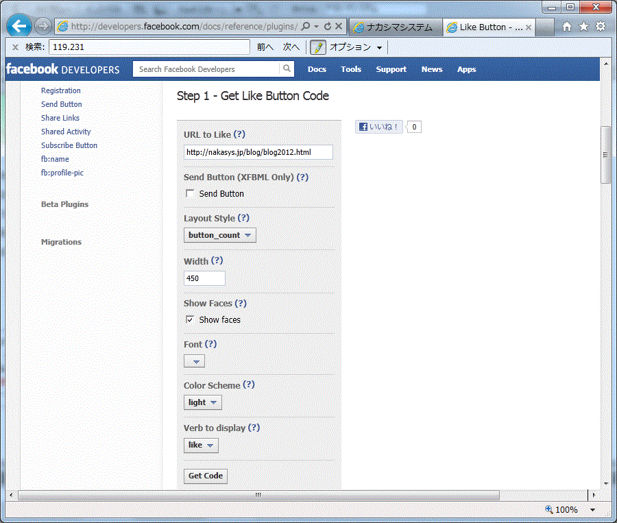 次のサイトでいいねのHTML(IFRAME)が生成可能だ。