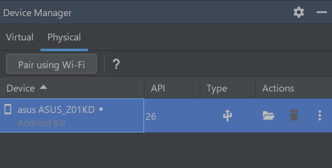 Android StudioのdeviceのPhysicalに自分の端末名が出ればOK